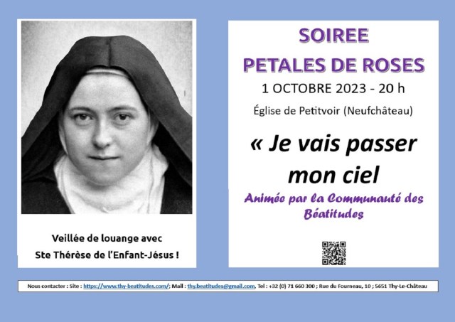 Dans le cadre du 150è anniversaire de la naissance de Thérèse de Lisieux, une soirée “pétales de roses” est organisée en province de Luxembourg dans le village de Petitvoir (Neufchâteau) dont l’église est dédié à la sainte.