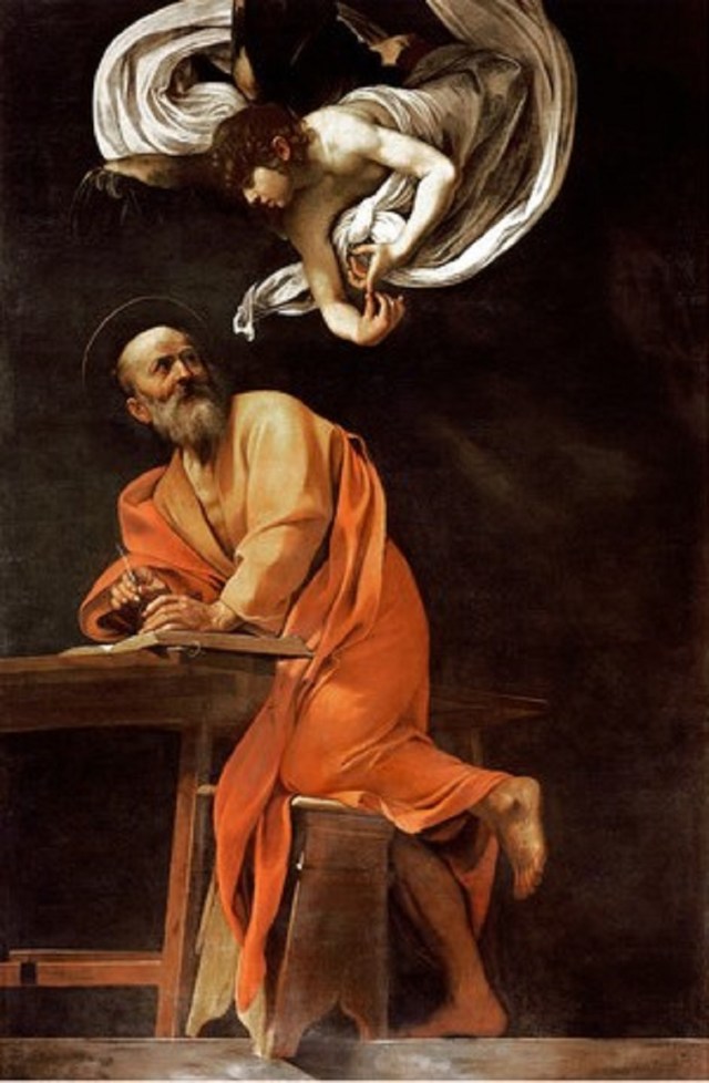 Intitulé « Saint Matthieu et l’Ange », ce tableau du Caravage dit beaucoup de ce que sont les évangiles pour l’Église. Contrairement à une première version qui fut rejetée, l’ange inspire l’évangéliste, mais ne lui tient pas la main. Pour l’Église et au contraire du Coran, les évangiles sont inspirés, mais non pas directement par Dieu. Pour les chrétiens, la foi est d’abord une relation personnelle avec Dieu d’où découlent des actes. (« Inspiré » des propos de Bosco d’Otreppe, « Deux kilos de Bible et autant d’humanité » – journal La Libre)
