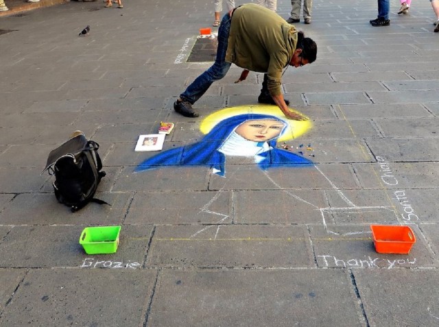 Le témoignage de cette Clarisse dialogue avec Etty Hillesum, bel exemple de confiance en un surcroît de Vie : elle a vécu et relevé ce défi, au milieu de la tourmente de l’oppression nazie. L’émerveillement est à l’origine de tout. Entrer en émerveillement envers et contre tout, c’est de notre seule responsabilité. L’émerveillement nous ouvre aux autres et à la vie. « Quelque chose de spacieux se révèle en nous ». (Photo : un artiste de rue dessinant, à Assise, un portrait de sainte Claire)
